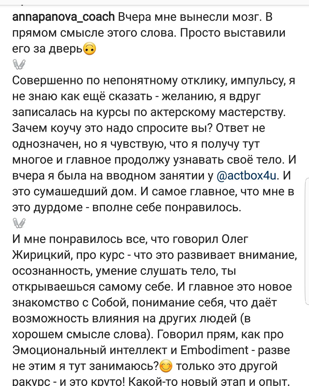 Олег!!!!!! Это курс как Антистресс!!!! в этих суровых обстоятельствах сегодняшнего времени! Работая в этой программе - супер как помогло и помогает справляться с сегодняшними обстоят. Олег! Спасибо за стабилизацию психо- эмоц состояния!!! 2. Для меня работа на курсе он - Лайн оказалась супер плодотворной! Я за 2 мес учебы в реальном режиме не могла увидеть, сделать то что делаю и сделала на курсе он/ Лайн. Я увидела себя со стороны!Олег! ваша обратная связь в заданиях - это просто клад для ученика!!! Действенная задача, Сценические задачи, словесные действия- вообще пока не получ. Но!!!! У меня появилось понимание , что не так, что надо, в чем суть? И гл - я таааааак хочу учиться, научиться этому!!!!прям азарт внутри! Такой « поток» воодушевления, творчества, азарта, интереса....!этот курс!!!!. А про голос - я в ходе вообще узнала , что он у меня есть!!!!))))), какой?) и оказывается может быть разный и им можно владеть))))))